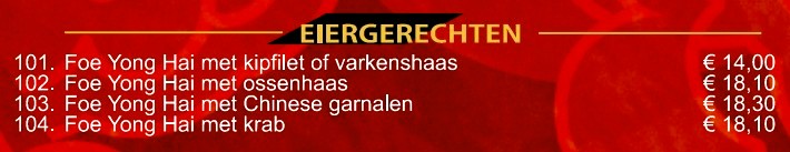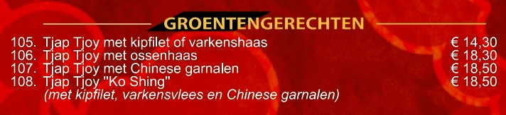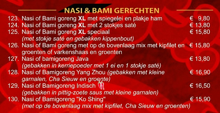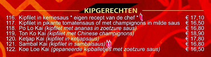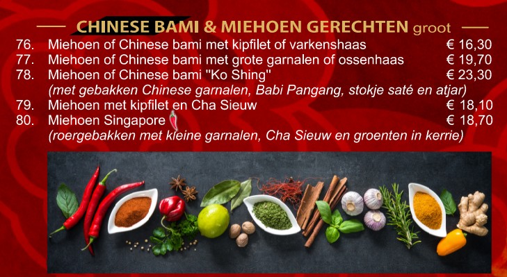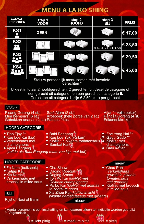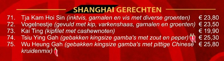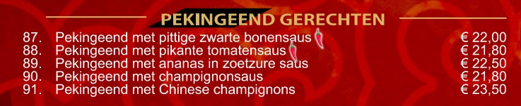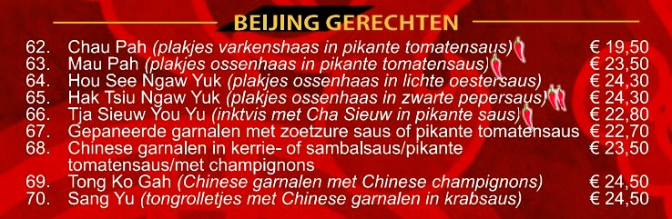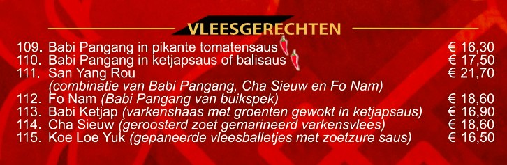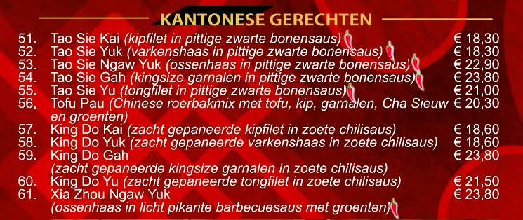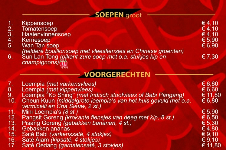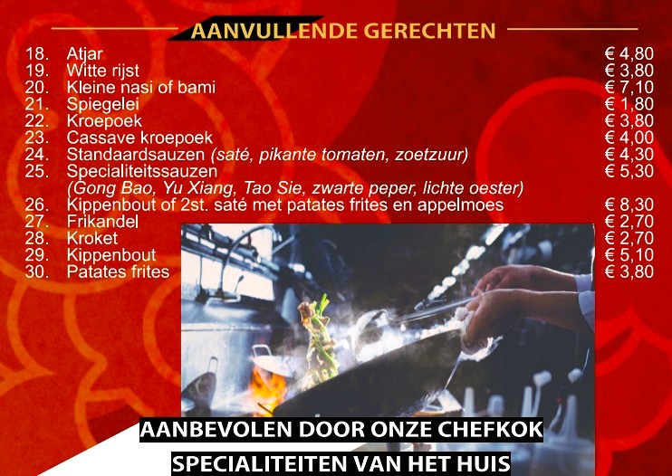 Naast de bekende gerechten als Babi Pangang, Foe Yong Hai en Tjap Tjoy, is onze unieke design menukaart ANNO 2026 met afhaalgerechten aangevuld met specialiteiten uit verschillende Chinese streken. Deze specialiteitsgerechten hebben een eigen signatuur.